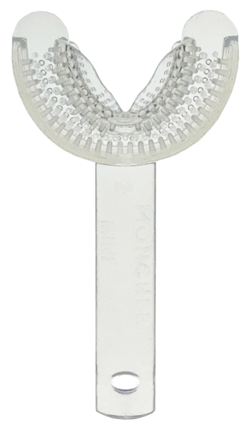 Shaped like a mouthguard, with a handle attached, the mouthpiece is soft, but durable, with lots of silicone prongs, which massage the teeth and gums.