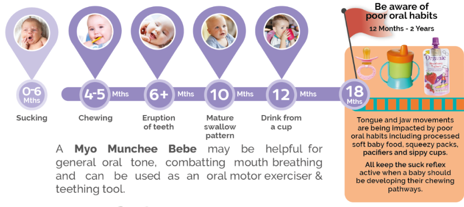 Tiny moments with the Myo Munchee Bebe, can have big impacts on your baby’s oral health development and function.