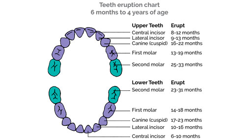 - Teething will often start around this time with the eruption of the 2 bottom teeth first followed by the 2 top teeth.