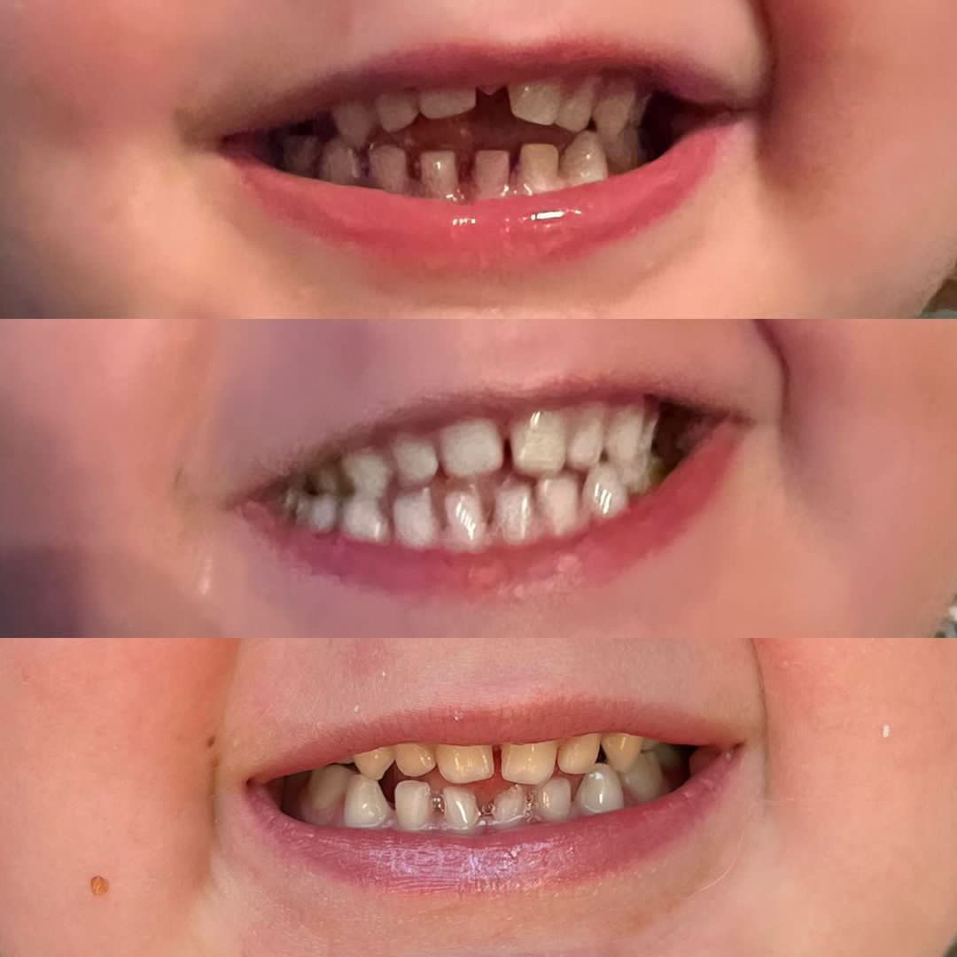 “My son Jason finally agreed to give up his pacifier at 3 years and 4 months old. He was only using it at night and nap time, but his teeth were flared so much from years of pacifier use. He also has a tongue tie, so I know oral formation is very important in these young years. We introduced the Munchee the day the pacifier went away. He uses it at bedtime during books, started with 5 minutes, then increased to all of book time, so sometimes 25 minutes. These photos are 2 months apart. His big sister is also using a Munchee so they love going to get theirs together and munching away! I think the Munchee helped him transition out of the pacifier because it does the job to soothe him as he is preparing for bed. I can’t wait to see the continued results.”